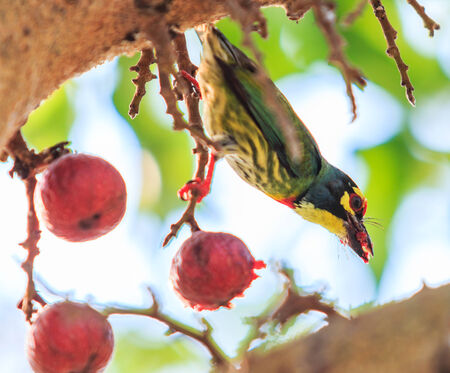 A coppersmith Barbet Bird perched on a branch eating a fruit
