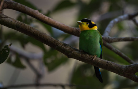 Generative AI : Beautiful bird Blackandred Broadbill Cymbirhynchus macrorhynchos rest on branch in nature