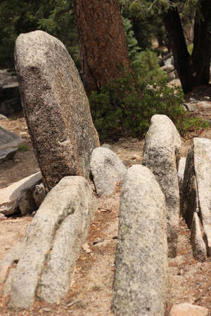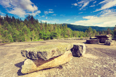 The camp of ancient people, the cemetery. Tombstones, funerary structures. Huge stones on the green grass. In the distance is a forest, trees.