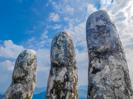 Concrete stone finger of a Golden Bridge in Ba Na hills, Da Nang, Vietnam on a sunny day. Iconic world famous bridge in the mountains