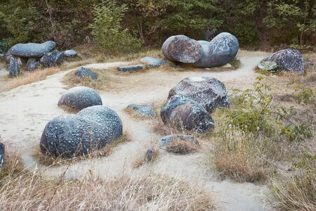 Museum of living stones Trovantilor in the open, Romania. Unusual stones in the sand quarry.