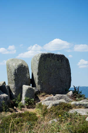 View of megaliths at the top of the mountain on blue sky background