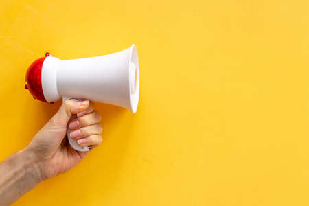A woman's hand holding a pink megaphone isolated on a yellow background. Creative announcement concept. Loud voice of women. Women's rights and voice. Advertisement mock up with copy space for text.