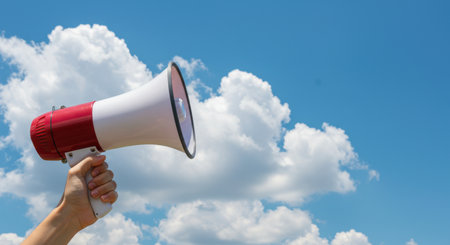 Hand holding a red and white megaphone, symbolizing announcement, protest, and public attention. vibrant blue sky with fluffy white clouds in the background.