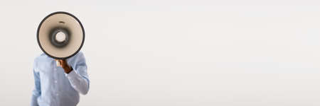Close up female holds in hand bullhorn public address megaphone isolated on white background. Hot news, announce discounts sale, communication concept. Copy space. Advertising area