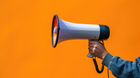 hand is holding megaphone on orange background, announcement concept, closed up, copy space