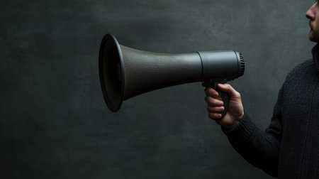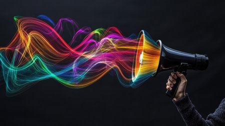 A hand gripping a megaphone, ready to announce, with vibrant sound waves emanating from it, symbolizing marketing and communication