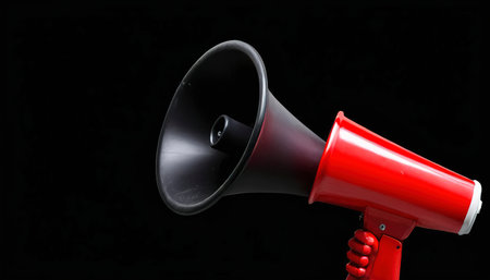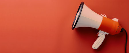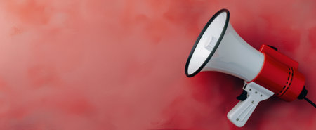 A bright red megaphone rests at an angle on a solid red surface, creating a bold visual contrast. Its sleek design features a black handle and a white mouthpiece, emphasizing its role in communication.
