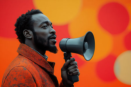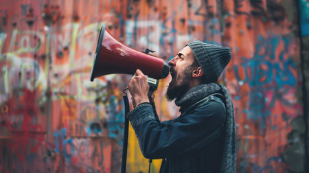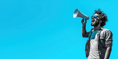 A young man passionately speaks through a megaphone, advocating for social change under a clear blue sky. His intense expression reflects determination and commitment to the cause.