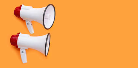 A close-up of a vintage white and yellow megaphone lying on a gray textured background. A concept of advertising, marketing and communication
