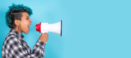 Woman holding a megaphone on a blue background with copy space. Generative AI.