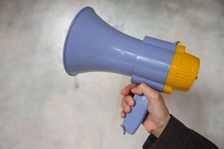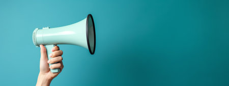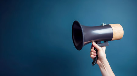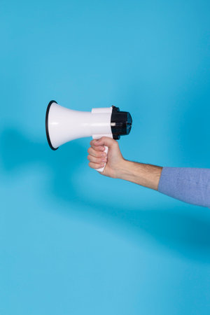 A human hand holds a blue and white megaphone, symbolizing communication, public announcement, and attention. Ideal for concepts of protest, marketing, or important messages.