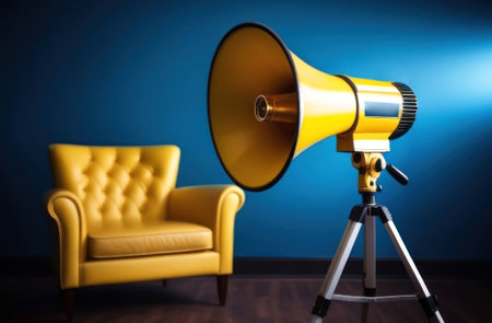 Striking image of a retro megaphone on a tripod, juxtaposed with a classic yellow armchair against a vivid blue background - perfect for bold visual statements