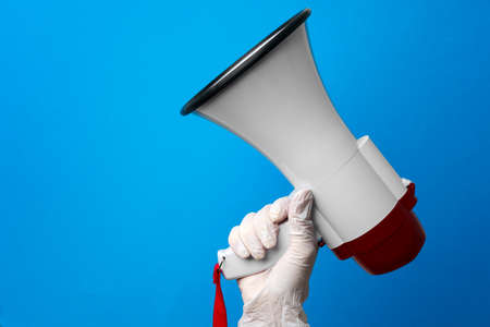 Attention please. Unknown mans hand on light blue background holds loudspeaker which is symbol of advertising, PR and promotion. Alert, announcement, warning and advertising concept. Copy space.