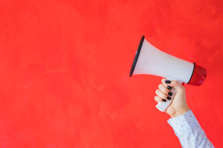 Generative AI, megaphone in hand on an empty red background, panoramic image with copy space