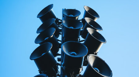 A set of weatherproof loudspeakers mounted high on a pole, with clear blue sky in the background, ideal for public alerts 4f