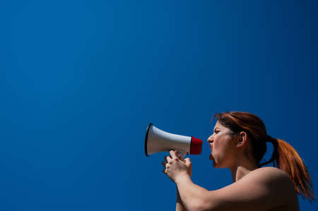 Red-haired Caucasian woman yelling into a megaphone against a blue sky background. The girl makes an announcement through the loudspeaker.