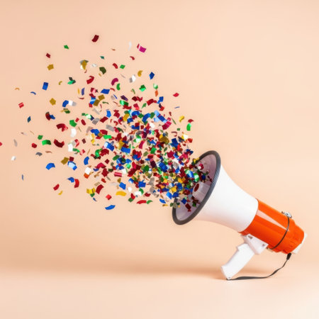 An orange and white megaphone is blowing colorful confetti into the air. The confetti pieces are in various colors including red, blue, green, yellow, and more. The image conveys a sense of celebration and announcement.