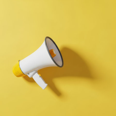 A white megaphone with a yellow mouthpiece is positioned on a vibrant yellow background, casting a distinct shadow.