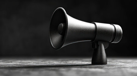 A classic megaphone, rendered with a metallic and wooden finish, is isolated against a dark backdrop. The image showcases the object's details, emphasizing its shape and texture. It is likely used for marketing materials, presentations or any visual content related to communication. The lighting is focused, casting shadows.