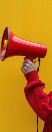 Feminine hand holding a red megaphone confidently against a pastel purple background, conveying empowerment or announcement
