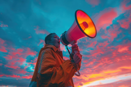 The photo shows a person shouting through a megaphone with a beautiful sky in the background. The person is wearing a yellow jacket and the megaphone is pink.