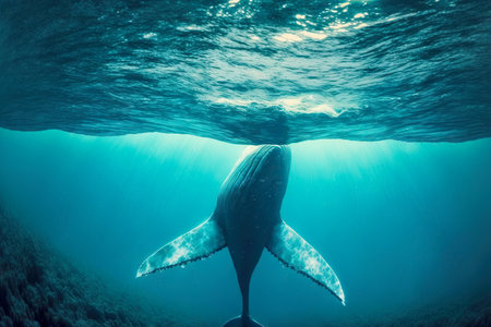 A whale is swimming in the ocean with the sun shining on it. Concept of freedom and beauty as the whale gracefully moves through the water