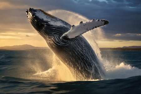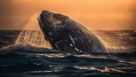 Majestic humpback whale splashing in tranquil seascape at sunset generated by artificial intelligence