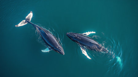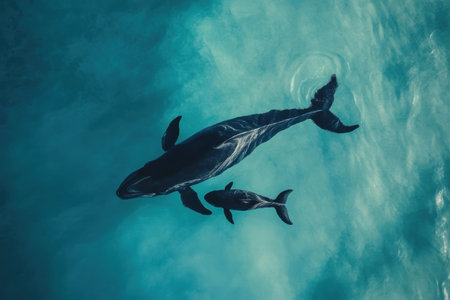 A mother whale and her calf glide together through the serene and clear blue ocean waters, highlighting their bond in natures tranquility.