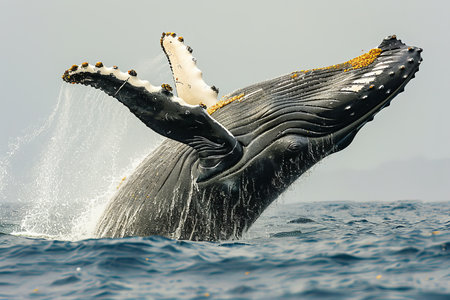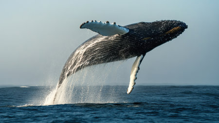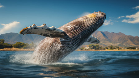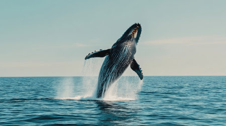 AI-Generated image of a majestic humpback whale breaching high above the ocean surface, water droplets cascading from its body as it arcs gracefully under a clear blue sky.