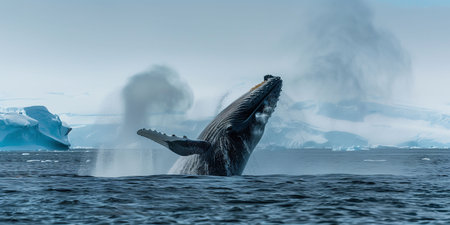 A humpback whale breaches powerfully in front of a stunning Antarctic iceberg scene