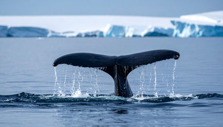 A powerful humpback whale bids farewell with a majestic flip of its tail, water cascading like a curtain as it dives deep into the frigid, nutrient-rich waters of Antarctica.