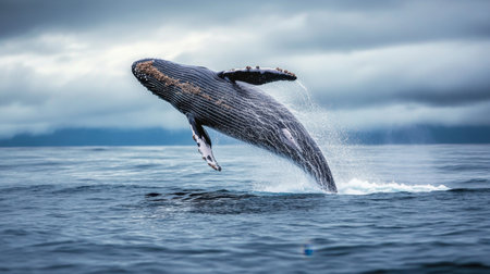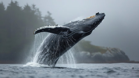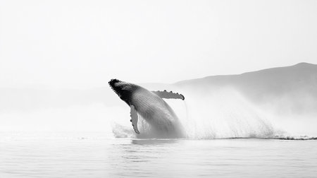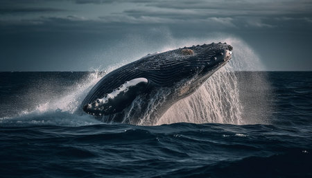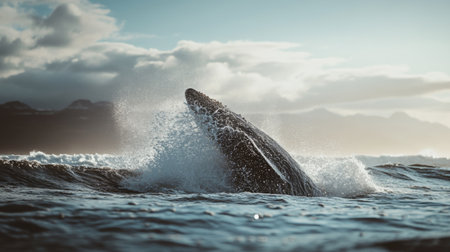A breathtaking scene captures a whale breaching the ocean's surface, creating dynamic splashes and reflecting the beauty of marine life in nature's environment.
