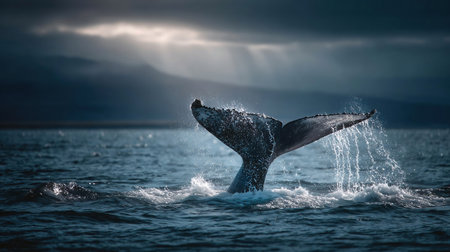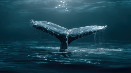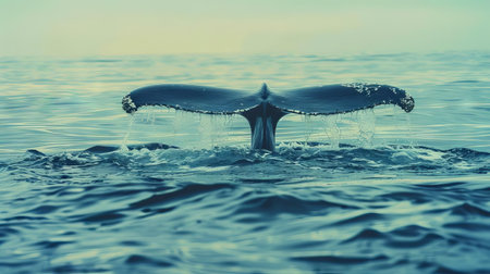 A stunning image captures a whale tail breaking the surface of deep water, showcasing the grace and beauty of marine life beneath gentle sunlight.