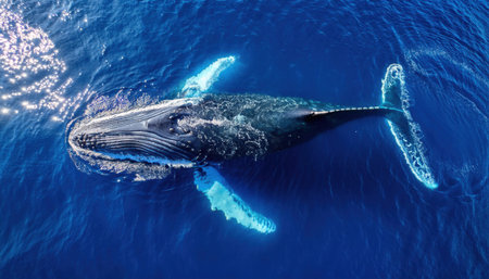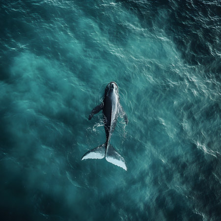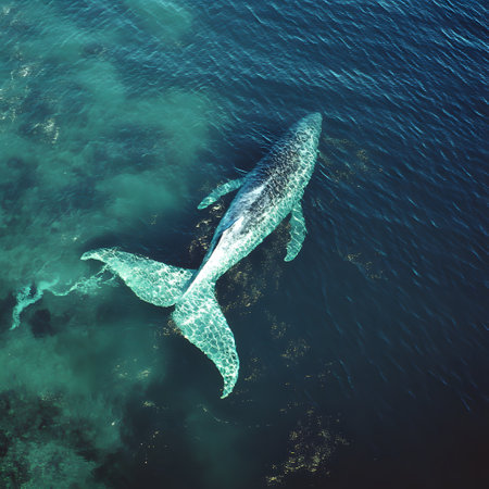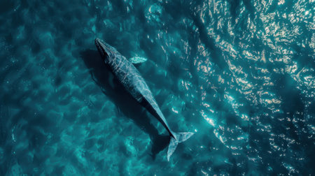 whale captured from above, gracefully gliding through the serene turquoise ocean depths.