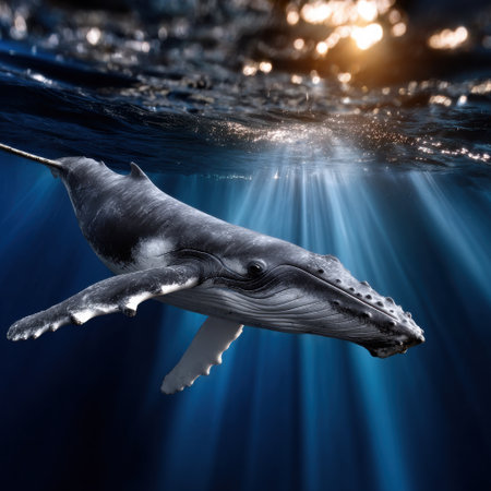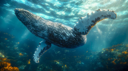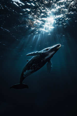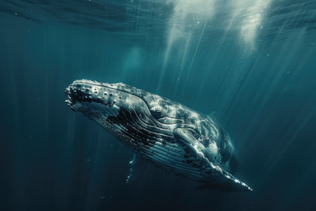 A dramatic underwater scene featuring a massive humpback whale gliding gracefully through the deep blue ocean. Sunbeams penetrate the water, illuminating the gentle giant in an ethereal glow.