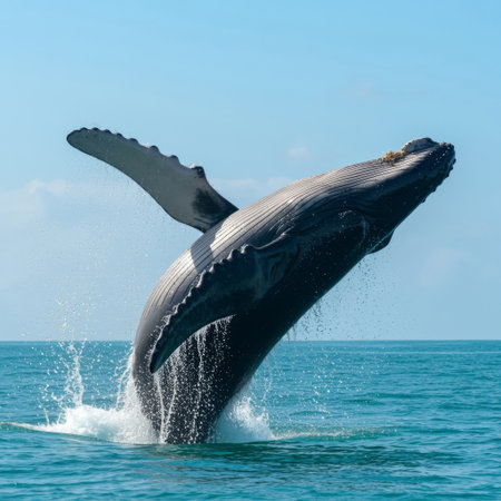 An awe-inspiring view of a humpback whale breaching the ocean surface, showcasing its grandeur against the vibrant blue waters and clear skies.