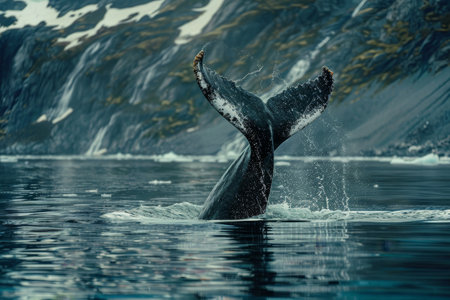 Majestic Winter Fjord Scene With Whale Tail Plunging Down Into the Icy Arctic Ocean Waters Below