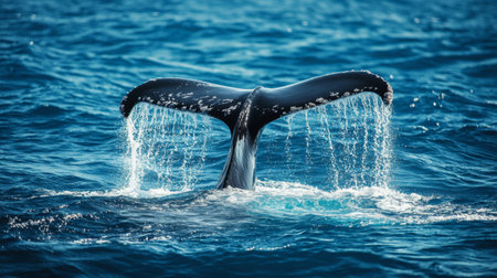 A stunning view of a whale's tail splashing in vibrant blue ocean water, capturing the beauty and grace of marine life in its natural habitat.