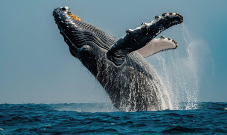 Spectacular Humpback Whale Breaching Massive marine mammal jumps out of the ocean water splashing vigorously against a bright blue sky background