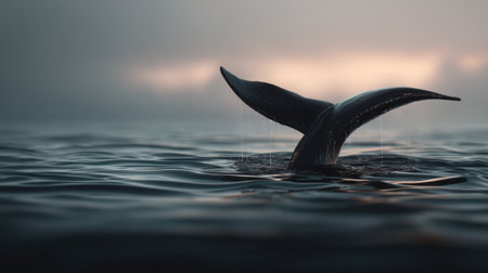 A stunning view of a whale tail breaking the surface of tranquil water at sunset, surrounded by a misty atmosphere that captures the beauty of marine life.