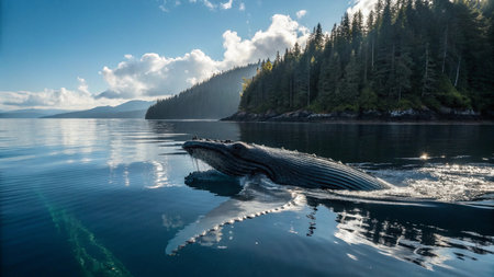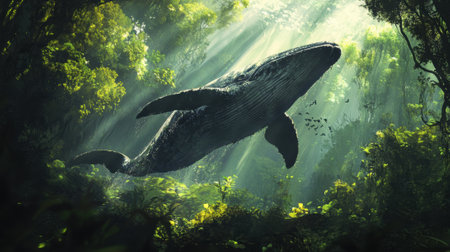 A whale swimming in the ocean surrounded by trees and plants, AI