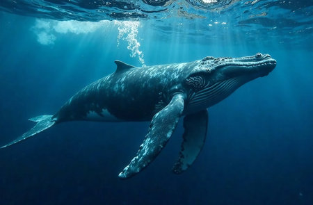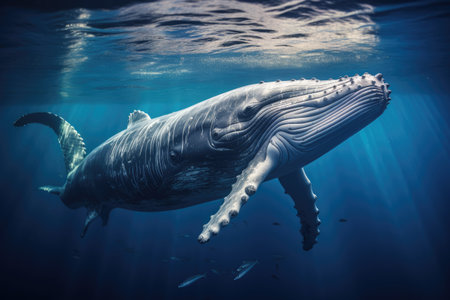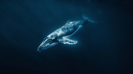 Majestic whale gliding gracefully in deep blue ocean waters. concept of marine life, underwater exploration, oceanic beauty.