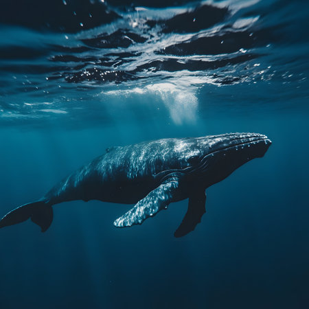 A majestic humpback whale swimming in the deep blue ocean with shimmering sunlight on the surface.