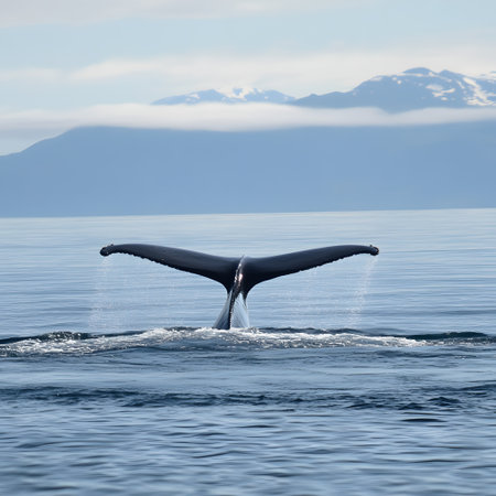 Majestic Whale Tail Emerges from Glimmering Waters Against a Stunning Winter Landscape Reflection
