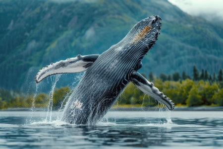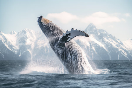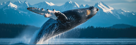 A magnificent humpback whale erupts from the deep blue waters, sending a spray into the air as it breaches. Framed by towering snow-capped mountains, this moment captures nature's splendor.