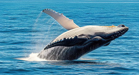 back whale breaching in majestic blue waters generated by artificial intelligence