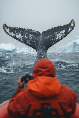 A photographer in an orange jacket captures a whale's tail in icy waters with a blue background.