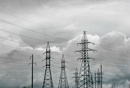 high-voltage power lines at storm clouds. electricity distribution station. high voltage electric transmission tower.