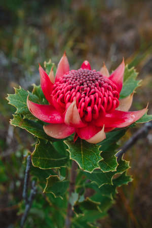 native Australian protea plant with round red flowers in bloom shot at shallow depth of field